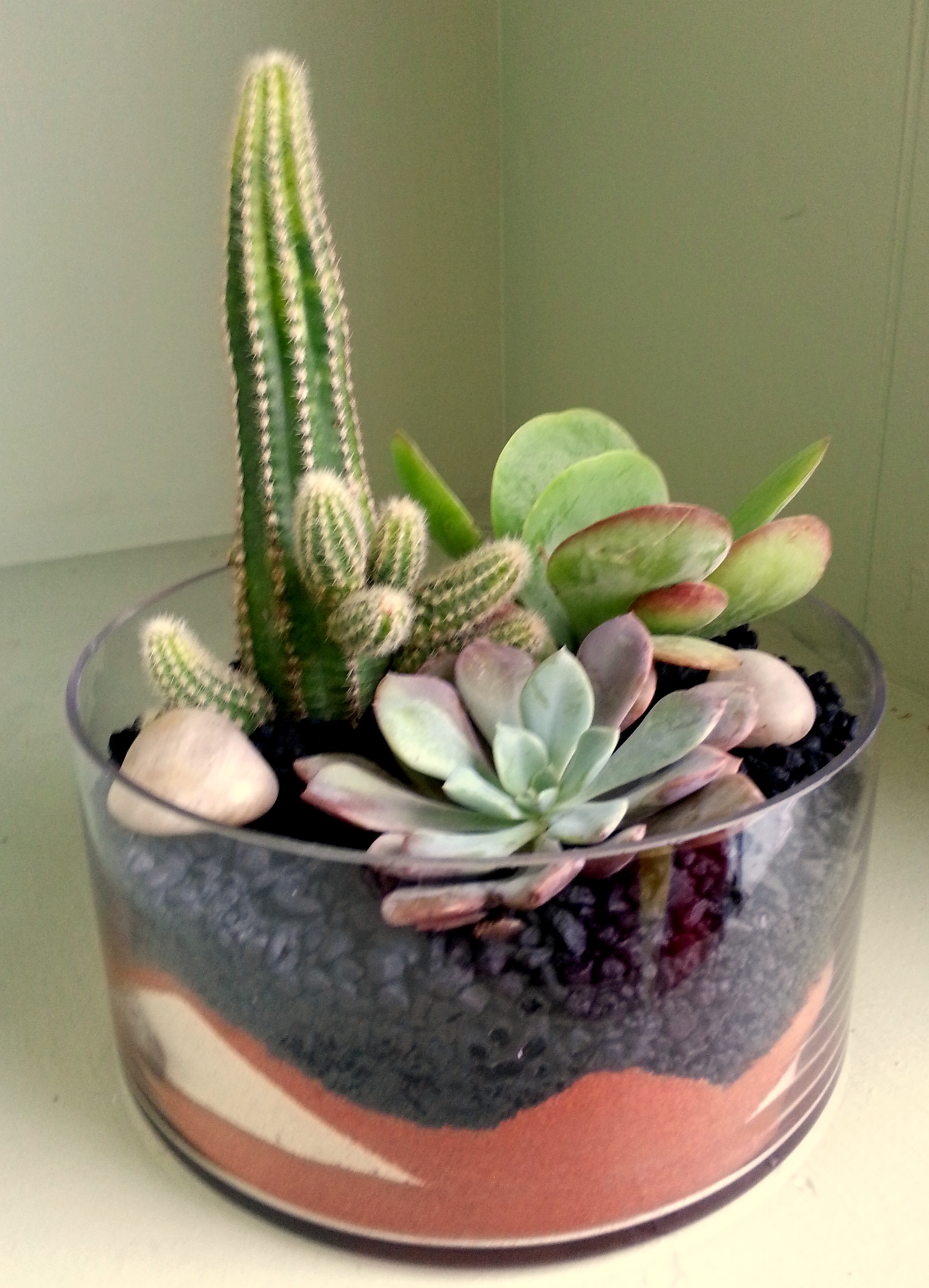 Various succulent plants and/or cacti are planted in a glass cylinder accented with various sands and rocks. Exact plant types may vary based on availability. This unique gift is easy to care for and exclusively available at Grande Flowers. Grande Flowers offers delivery of plants to Shorewood, Milwaukee, Whitefish Bay, Glendale and surrounding areas.